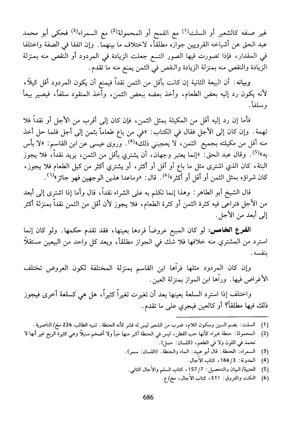 غير صنفه كالشعير أو السلت مع القمح أو المحمولة مع السمراء فحكى أبو محمد عبد الحق عن أشياخه القرويين جوازه مطلقاً، لاختلاف ما بينهما. وإن اتفقا في الصفة واختلفا في المقدار، فإذا تصورت فيها الصور التسع جعلت الزيادة في المردود أو النقص منه بمنزلة الزيادة والنقص منه بمنزلة الزيادة والنقص في الثمن يمنع منه ما تقدم.