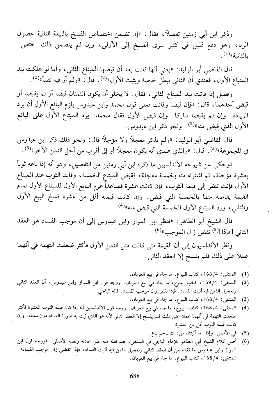 ((وحكى عن شيوخه الأندلسيين ما ذكره ابن أبي زمنين من التفصيل، وهو أنه إذا باعه ثوباً بعشرة مؤجلة، ثم اشتراه منه بخمسة معجلة، فقبض المبتاع الخمسة، وفات الثوب عند المبتاع الأول فإنك تنظر إلى قيمة الثوب، فإن كانت عشرة فصاعداً غرم البائع الأول للمبتاع الأول تمام القيمة يقاصه منها بالخمسة التي قبض. وإن كانت قيمته أقل من عشرة فسخ البيع الأول والثاني، ورد المبتاع الأول الخمسة التي قبض منه)).