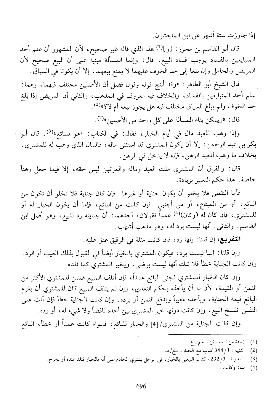 قال الشيخ أبو الطاهر: ((وقد أنتج قوله وقول فضل أن الأصلين مختلف فيهما، وهما: علم أحد المتبايعين بالفساد، والخلاف فيه معروف في المذهب، والثاني أن المريض إذا بلغ حد الخوف ولم يبلغ السياق مختلف فيه هل يجوز بيعه أم لا؟)).