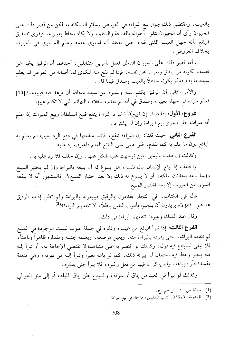 الفرع الثالث: إذا تبرأ البائع من عيب، وذكره في جملة عيوب ليست موجودة في المبيع لم تنفعه البراءة، حتى يفرده بالبراءة منه، ويعين موضعه، ويعلمه جنسه ومقداره ظاهراً وباطناً، فلا يبقى للمبتاع فيه قول، وكذلك لو اقتصر به على مشاهدة لا تقتضي الإحاطة به، أو تبرأ إليه منه بخبر ولفظ فيه احتمال لم يبرئه ذلك، كما لو باعه بعيراً وتبرأ إليه من دبرته، وهي منغلة مفسدة فأراه إياها، ولم يذكر ما فيها من نغل وغيره، فلا يبرأ حتى يذكره.