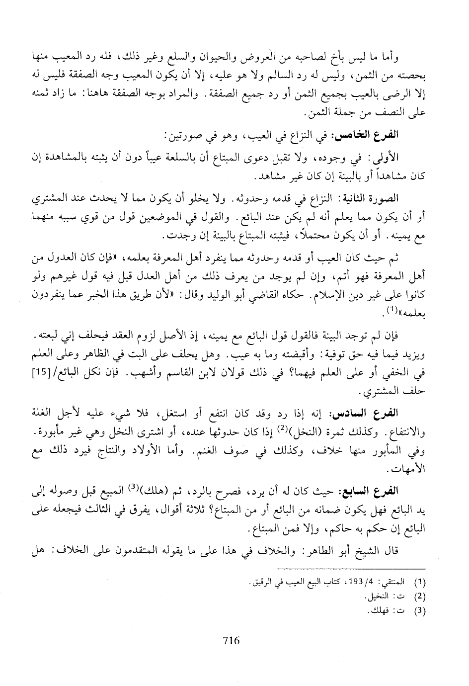 الأولى: في وجوده، ولا تقبل دعوى المبتاع أن بالسلعة عيباً دون أن يثبته بالمشاهدة إن كان مشاهداً أو بالبينة إن كان غير مشاهد.