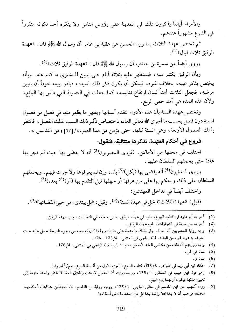 وبأن الرقيق يكتم عيبه، فيستظهر عليه بثلاثة أيام حتى يتبين للمشتري ما كتم عنه. وبأنه يختص بذكر عيبه، بخلاف غيره، فيمكن أن يكون ذكر ذلك لسيده، فبادر ببيعه خوفاً أن يتبين مرضه، فجعل الثلاث أمداً لبيان ارتفاع تدليسه، كما جعلت في التصرية التي دلس بها البائع، ولأن هذه المدة هي أمد حمى الربع.