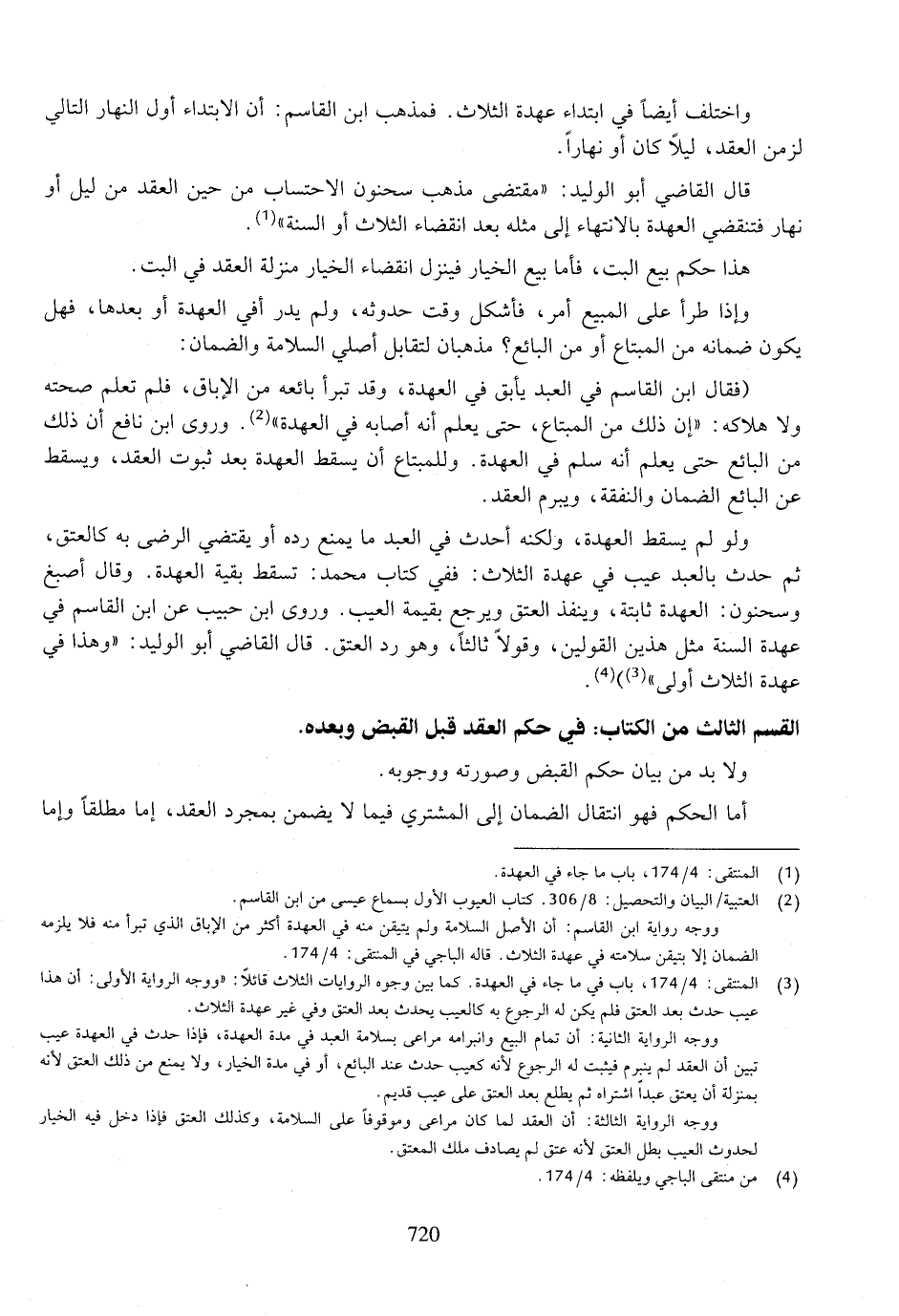 قال القاضي أبو الوليد: ((مقتضى مذهب سحنون الاحتساب من حين العقد من ليل أو نهار فتنقضي العهدة بالانتهاء إلى مثله بعد انقضاء الثلاث أو السنة)).