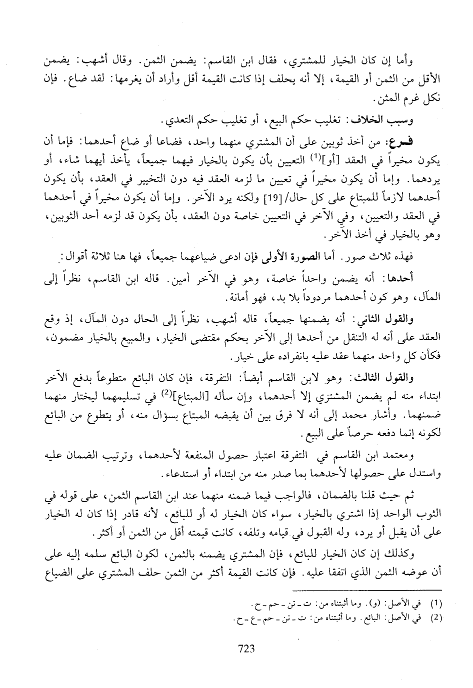 والقول الثاني: أنه يضمنها جميعاً، قاله أشهب، نظراً إلى الحال دون المآل، إذ وقع العقد على أنه لن التنقل من أحدها إلى الآخر بحكم مقتضى الخيار، والمبيع بالخيار مضمون، فكأن كل واحد منهما عقد عليه بانفراده على خيار.