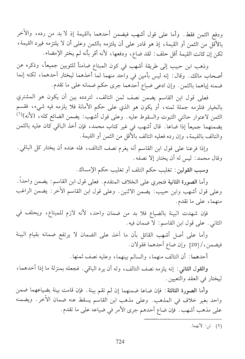 وذهب ابن حبيب إلى طريقة أشهب في كون المبتاع ضامناً للثوبين جميعاً، وذكره عن أصحاب مالك. وقال: إنه ليس بأمين في واحد منهما لما أخذهما ليختار أحدهما، لكنه إنما ضمنه إياهما بالثمن. وإن ادعى ضياع أحدهما جرى حكم ضمانه على ما تقدم.