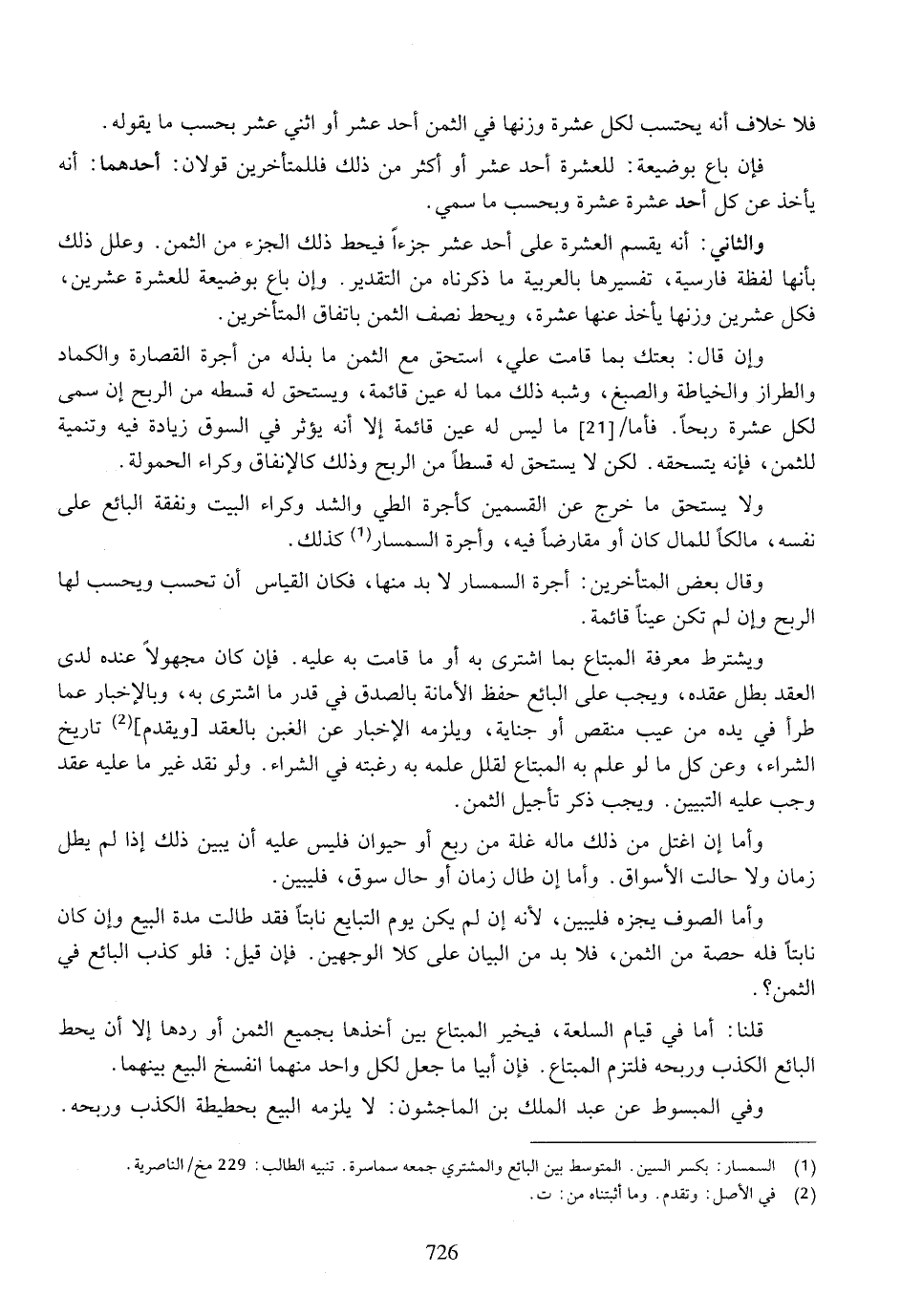 وقال بعض المتأخرين: أجرة السمسار لا بد منها، فكان القياس أن تحسب ويحسب لها الربح وإن لم تكن عيناً قائمة.
