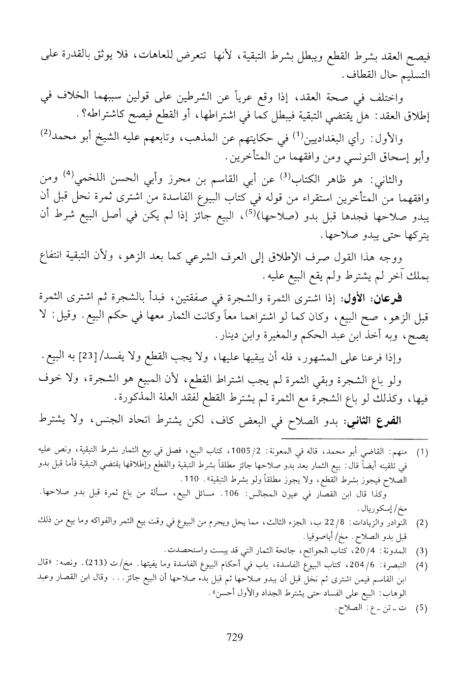 والثاني: هو ظاهر الكتاب عن أبي القاسم بن محرز وأبي الحسن اللخمي ومن وافقهما من المتأخرين استقراء من قوله في كتاب البيوع الفاسدة من اشترى ثمرة نخل قبل أن يبدو صلاحها فجدها قبل بدو (صلاحها)، البيع جائز إذا لم يكن في أصل البيع شرط أن يتركها حتى يبدو صلاحها.