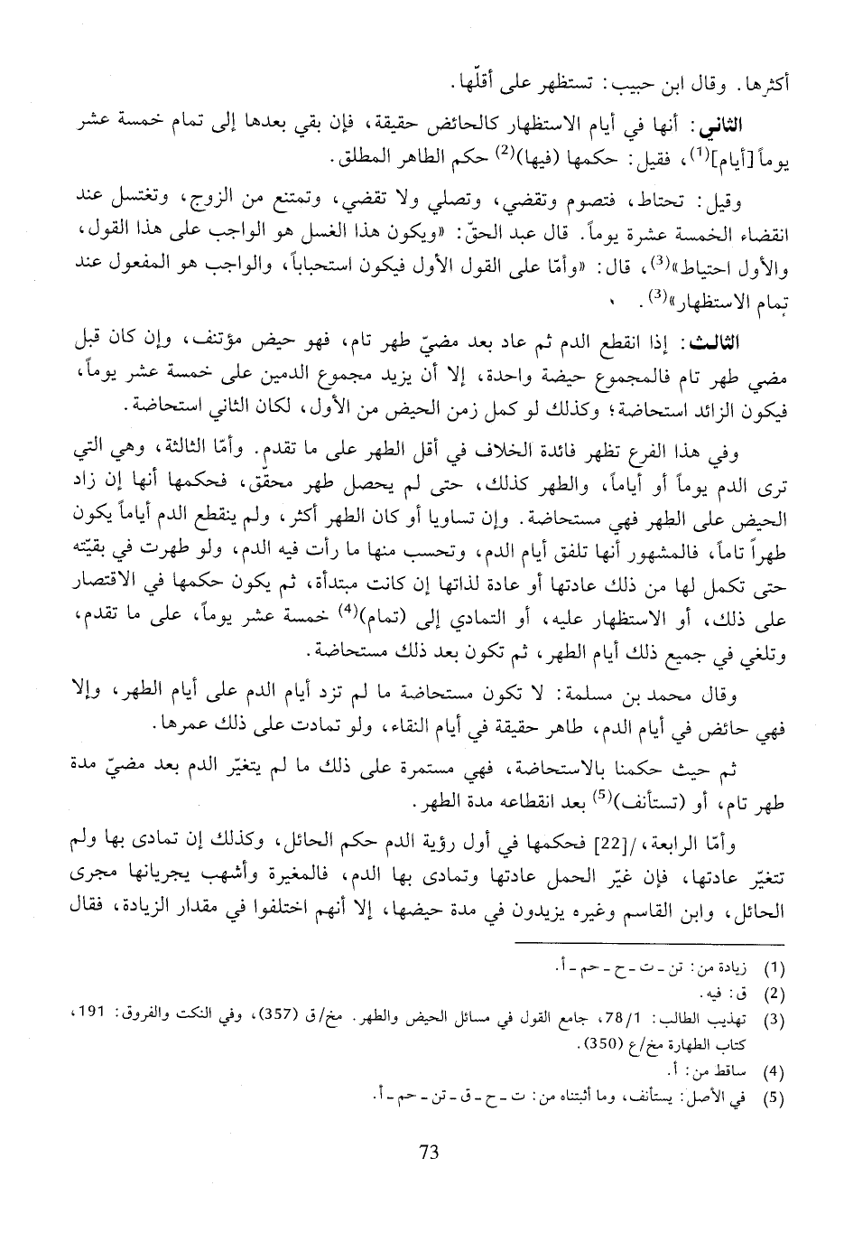 الثالث: إذا انقطع الدم ثم عاد بعد مضي طهر تام، فهو حيض مؤتنف، وإن كان قبل مضي طهر تام فالمجموع حيضة واحدة، إلا أن يزيد مجموع الدمين على خمسة عشر يوما، فيكون الزائد استحاضة، وكذلك لو كمل زممن الحيض من الأول، لكان الثاني استحاضة.