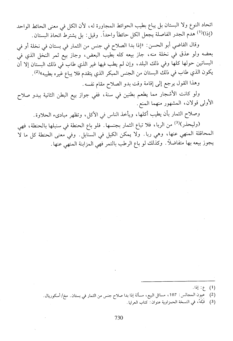 اتحاد النوع، ولا البستان بل يباع بطيب الحوائط المجاورة له، لأن الكل في معنى الحائط الواحد (إذا) هدم الجدار الفاصلة يجعل الكل حائطاً واحداً. وقيل: بل يشترط اتحاد البستان.