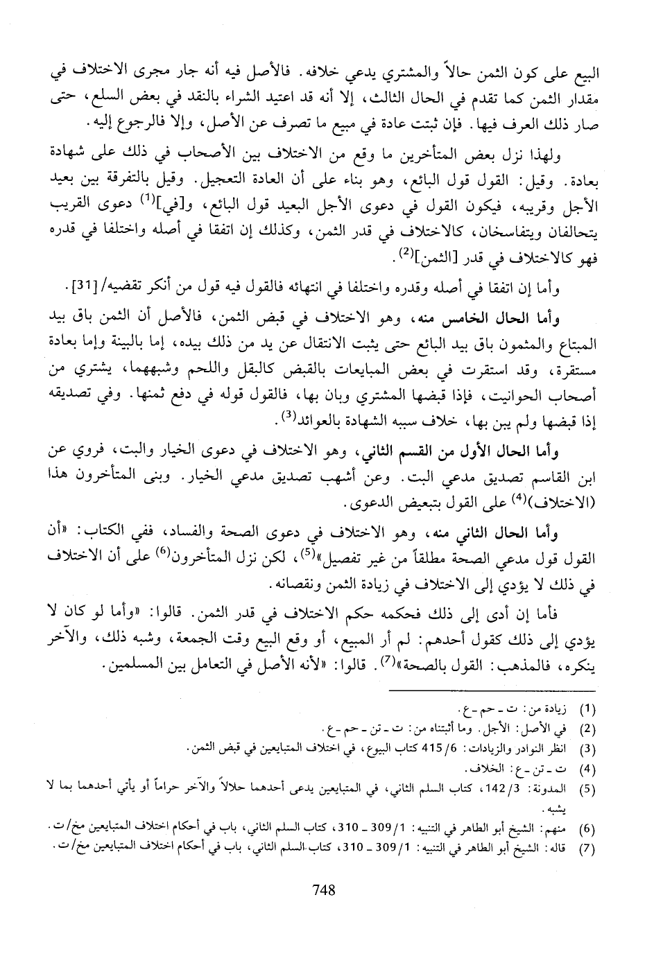 البيع على كون الثمن حالاً والمشتري يدعي خلافه. فالأصل فيه أنه جار مجرى الاختلاف في مقدار الثمن كما تقدم في الحال الثالث، إلا أنه قد اعتيد الشراء بالنقد في بعض السلع، حتى صار ذلك العرف فيها. فإن ثبتت عادة في مبيع ما تصرف عن الأصل، وإلا فالرجوع إليه.