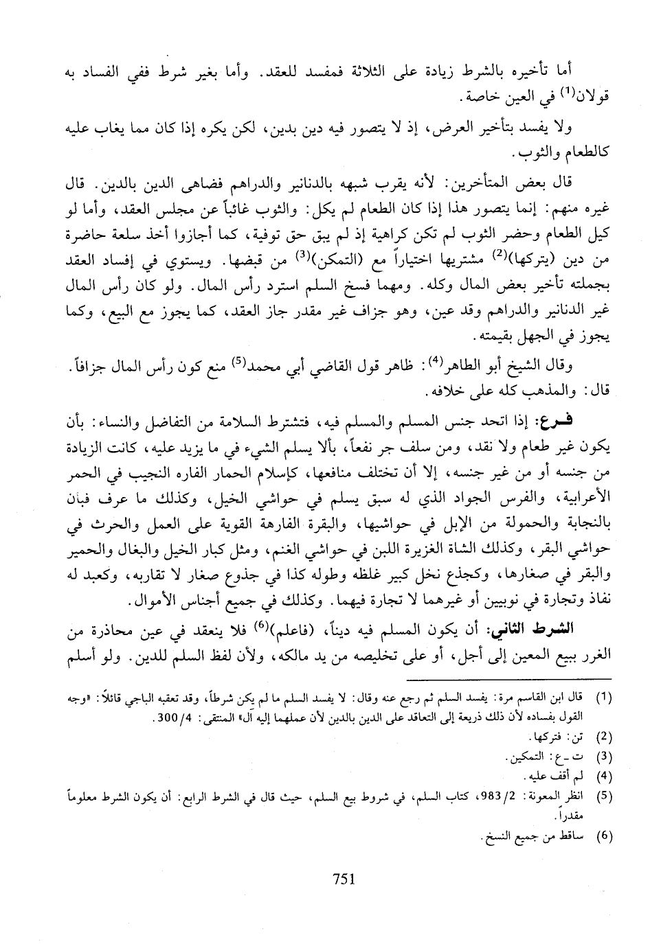 فرع: إذا اتحد جنس المسلم والمسلم فيه، فتشترط السلامة من التفاضل والنساء: بأن يكون غير طعام ولا نقد، ومن سلف جر نفعاً، بألا يسلم الشيء في ما يزيد عليه، كانت الزيادة من جنسه أو من غير جنسه، إلا أن تختلف منافعها، كإسلام الحمار الفاره النجيب في الحمر الأعرابية، والفرس الجواد الذي له سبق يسلم في حواشي الخيل، وكذلك ما عرف فبان بالنجابة والحمولة من الإبل في حواشيها، والبقرة الفارهة القوية على العمل والحرث في حواشي البقر، وكذلك الشاة الغزيرة اللبن في حواشي الغنم، ومثل كبار الخيل والبغال والحمير والبقر في صغارها، وكجذع نخل كبير غلظه وطوله كذا في جذوع صغار لا تقاربه، وكعبد له نفاذ وتجارة في نوبيين أو غيرهما لا تجارة فيهما. وكذلك في جميع أجناس الأموال.
