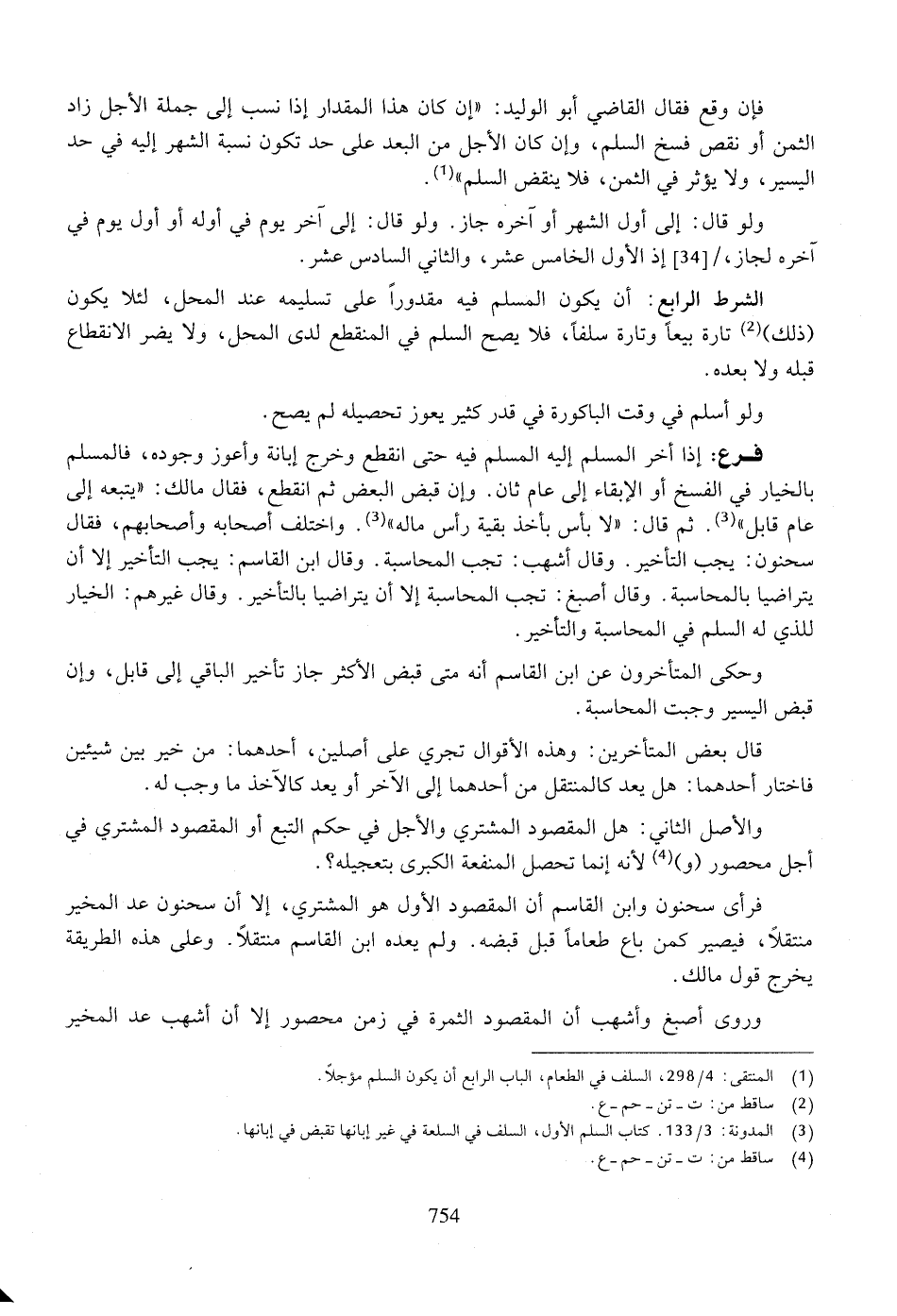 الشرط الرابع: أن يكون المسلم فيه مقدوراً على تسليمه عند المحل؛ لئلا يكون (ذلك) تارة بيعاً وتارة سلفاً، فلا يصح السلم في المنقطع لدى المحل، ولا يضر الانقطاع قبله ولا بعده.