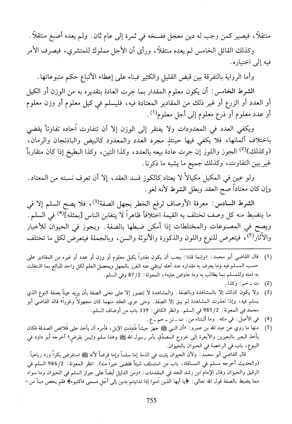 الشرط الخامس: أن يكون معلوم المقدار بما جرت العادة بتقديره به من الوزن أو الكيل أو العدد أو الزرع أو غير ذلك من المقادير المعتادة فيه، فليسلم في كيل معلوم أو وزن معلوم أو عدد معلوم أو ذرع معلوم إلى أجل معلوم.