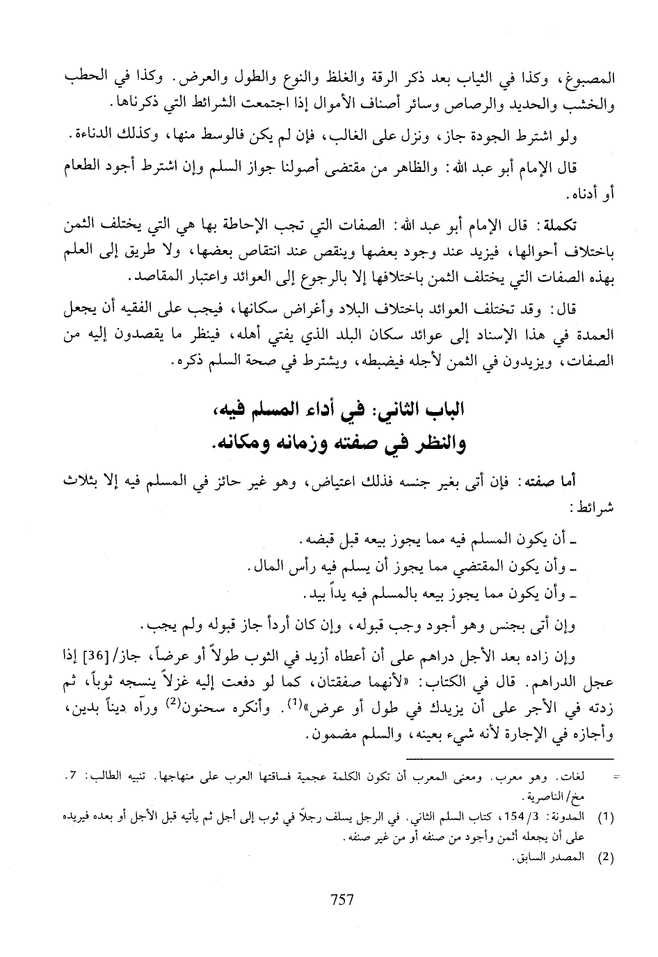 تكملة: قال الإمام أبو عبد الله: الصفات التي تجب الإحاطة بها هي التي يختلف الثمن باختلاف أحوالها، فيزيد عند وجود بعضها وينقص عند انتقاص بعضها، ولا طريق إلى العلم بهذه الصفات التي يختلف الثمن باختلافها وإلا بالرجوع إلى العوائد واعتبار المقاصد.