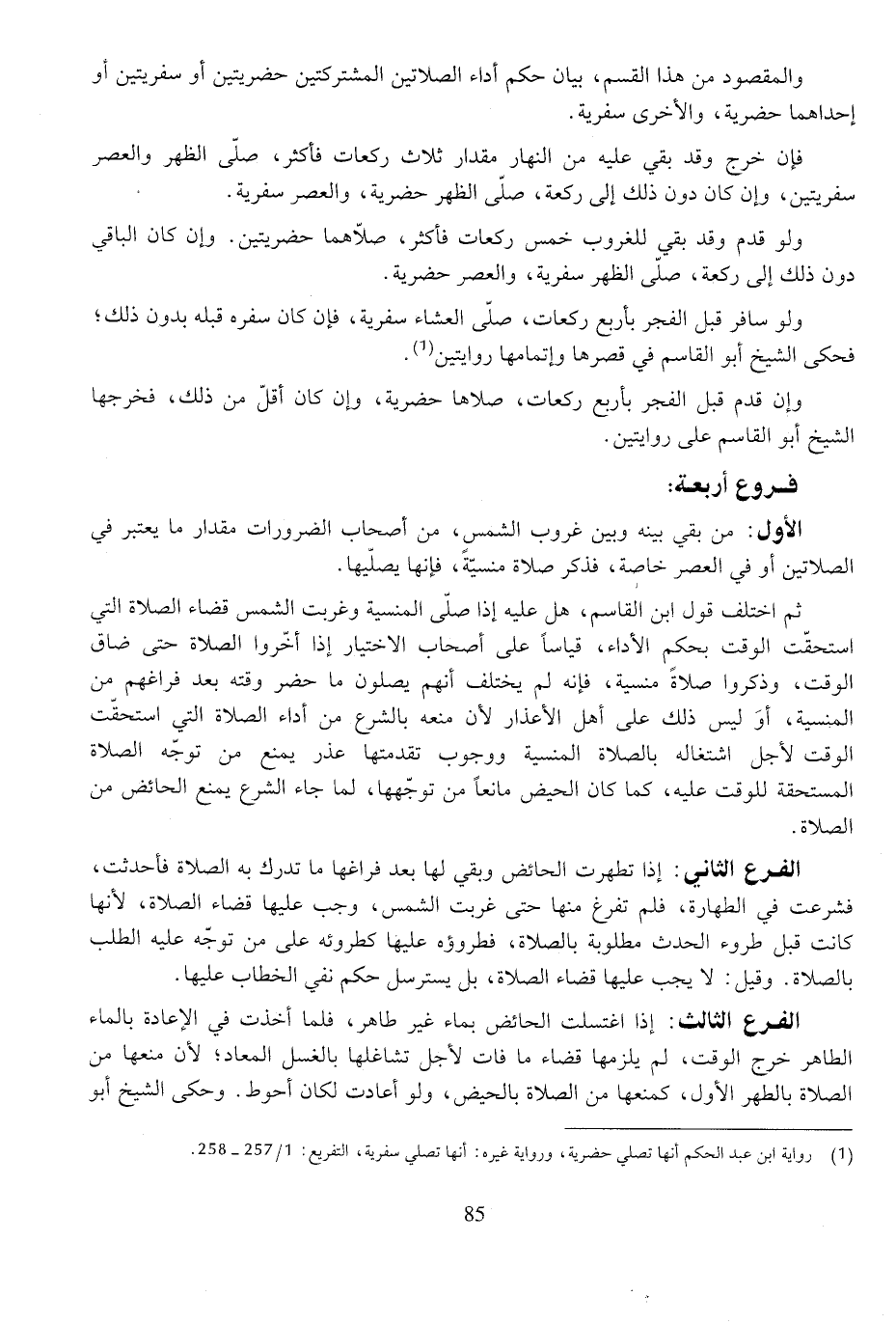 فإن خرج وقد بقي عليه من النهار مقدار ثلاث ركعات فأكثر، صلى الظهر والعصر سفريتين، وإن كان دون ذلك إلى ركعة، صلى الظهر حضرية، والعصر سفرية.