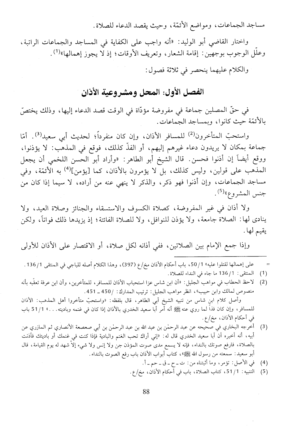 في حق المصلين جماعة في مفروضة مؤداة في الوقت قصد الدعاء إليها، وذلك يختص بالأئمة حيث كانوا، وبمساجد الجماعات.