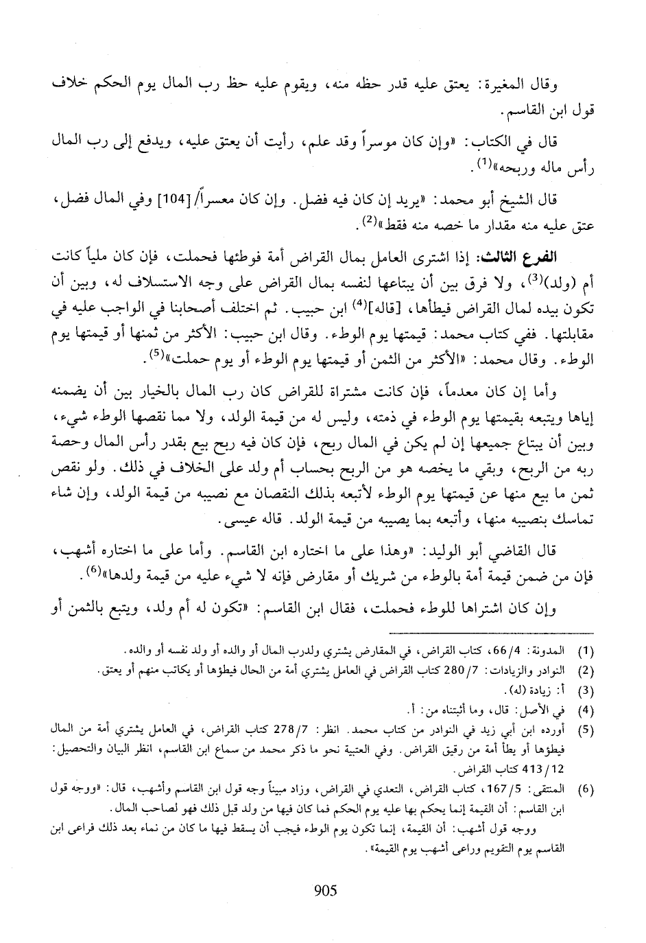 الفرع الثالث: إذا اشترى العامل بمال القراض أمة فوطئها فحملت، فإن كان مليًا كانت أم (ولد)، ولا فرق بين أن يبتاعها لنفسه بمال القراض على وجه الاستسلاف له، وبين أن تكون بيده لمال القراض فيطأها، [قاله] ابن حبيب. ثم اختلف أصحابنا فيالواجب عليه في مقابلتها. ففي كتاب محمد: قيمتها يوم الوطء. وقال ابن حبيب: الأكثر من ثمنها أو قيمتها يوم الوطء. وقال محمد: "الأكثر من الثمن أو قيمتها يوم الوء أو يوم حملت.