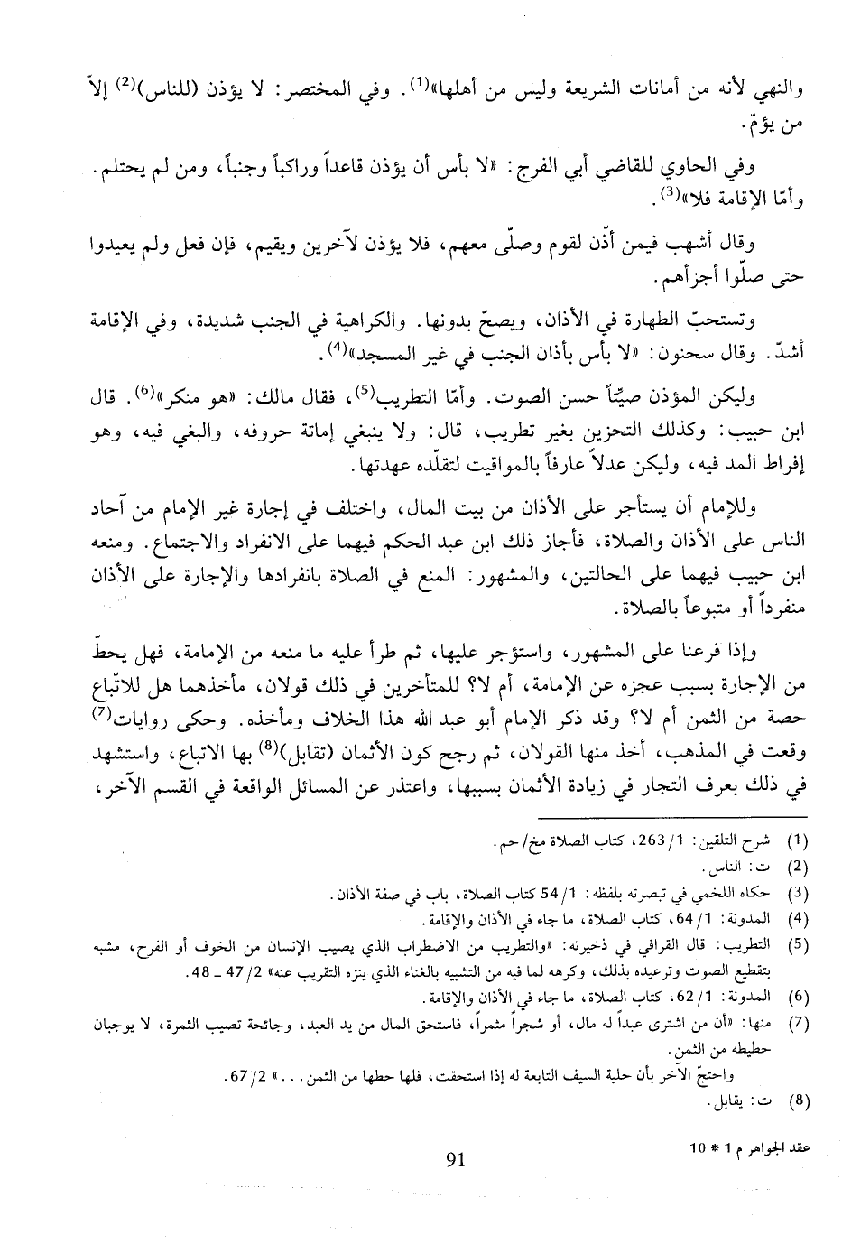 وللإمام أن يستأجر على الأذان من بيت المال، واختلف في إجارة غير الإمام من آحاد الناس على الأذان والصلاة، فأجاز ذلك ابن عبد الحكم فيهما على الانفراد والاجتماع. ومنعه ابن حبيب فيهما على الحالتين، والمشهور: المنع في الصلاة بانفرادها والإجارة على الأذان منفردا أو متبوعا بالصلاة.