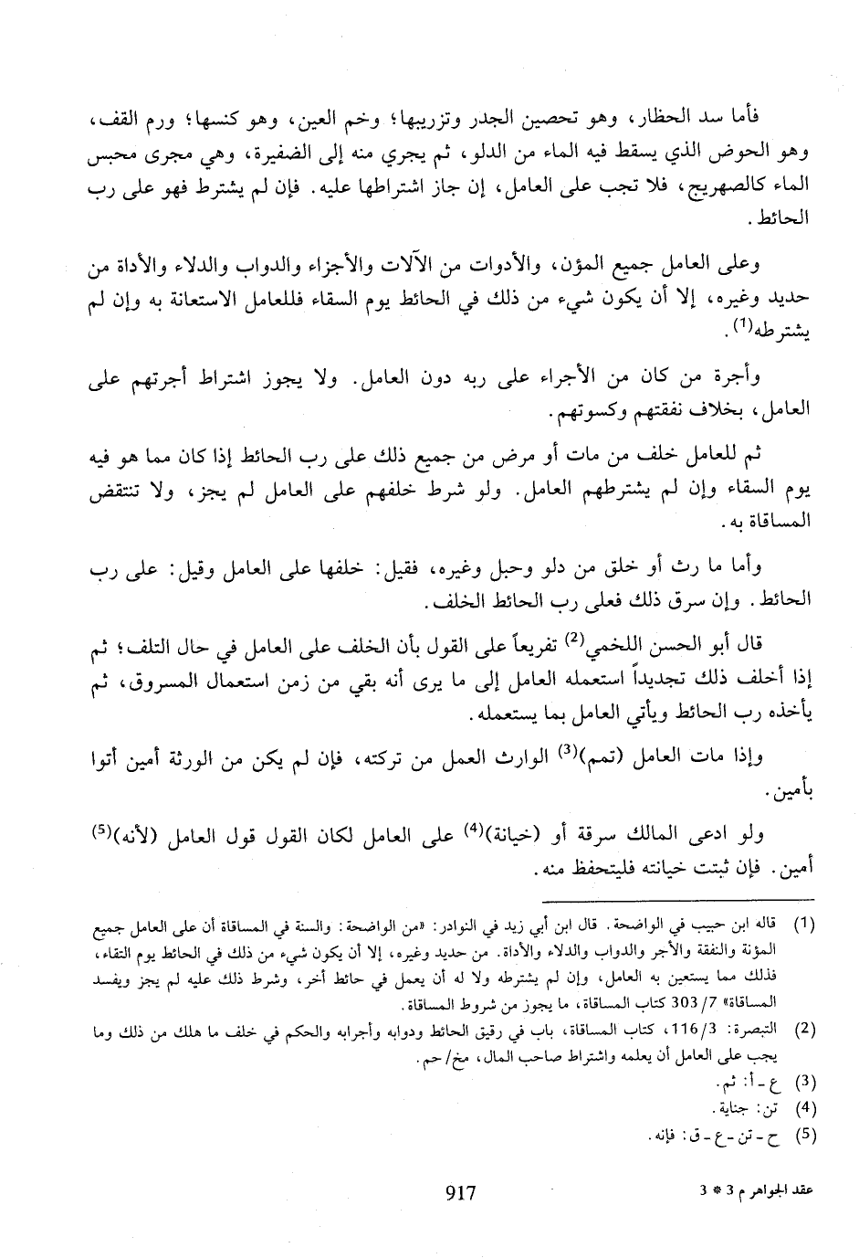 فأما سد الحظار، وهو تحصين الجدر وتزريبها؛ وخم العين، وهو كنسها؛ ورم القف، وهو الحوض الذي يسقط فيه الماء من الدلو، ثم يجري منه إلى الضفيرة، وهي مجرى محبس الماء كالصهريج، فلا تجب على العامل، إن جاز اشتراطها عليه. فإن لم يشترط فهو على رب الحائط.
