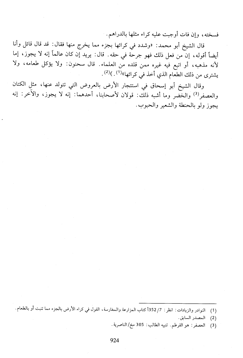 قال الشيخ أبو محمد: "وشدد في كرائها بجزء مما يخرج منها فقال: قد قال قائل وأنا أيضًا أقوله، إن من فعل ذلك فهو جرحة في حقه. قال: يريد إن كان عالمًا إنه لا يجوز، إما لأنه مذهبه، أن اتبع فيه غيره ممن قلده من العلماء. قال سحنون: ولا يؤكل طعامه، ولا يشتري من ذلك الطعام الذي أخذ في كرائها".