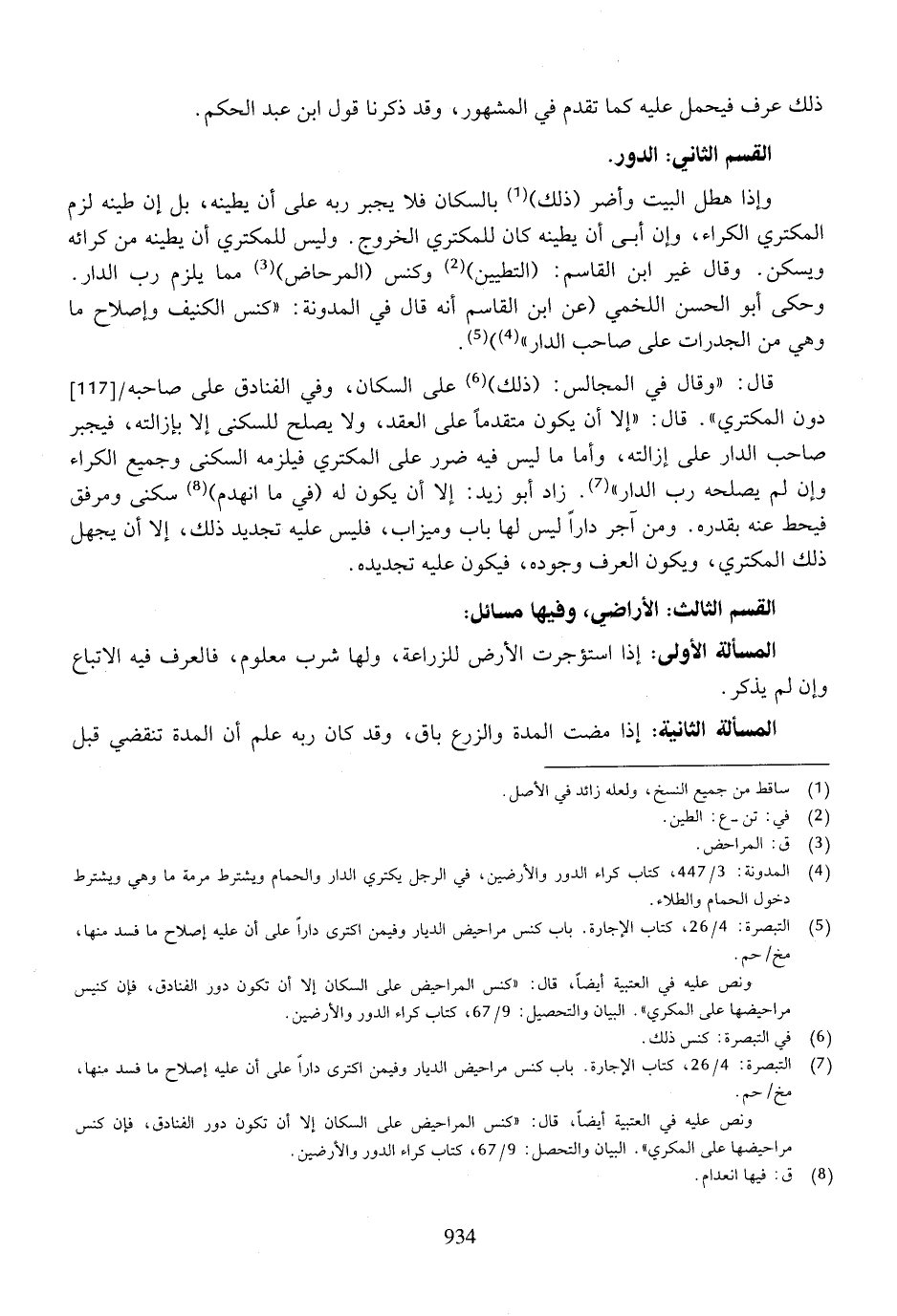 قال: "وقال في المجالس: (ذلك) على السكان، وفي الفنادق على صاحبه دون المكتري". قال: "إلا أن يكون متقدمًا على العقد، ولا يصلح للسكنى إلا بإزالته، فيجبر صاحب الدار على إزالته، وأما ما ليس فيه ضرر على المكتري فيلزمه السكنى وجميع الكراء وإن لم يصلحه رب الدار. زاد أبو زيد: إلا أن يكون له (في ما انهدم) سكنى ومرفق فيحط عنه بقدره. ومن آجر داراً ليس لها باب وميزاب، فليس عليه تجديد ذلك، إلا أن يجهل ذلك المكتري، ويكون العرف وجوده، فيكون عليه تجديده.