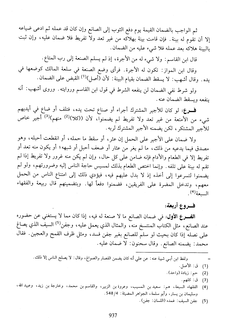 الفرع الأول: في ضمان الصانع ما لا صنعة له فيه، إذا كان مما لا يستغني عن حضوره عند الصانع، مثل الكتاب المنتسخ منه، والمثال الذي يعمل عليه، وجفن السيف الذي يصاغ على نصله إذا كان بحيث لو سلم للصانع بغير جفن فسد، ومثل ظرف القمح والعجين. فقال محمد: يضمنه الصانع. وقال سحنون: لا ضمان عليه.