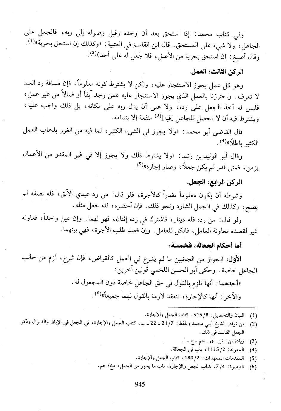 وقال أبو الوليد بن رشد: "ولا يشترط ذلك ولا يجوز إلا في غير المقدر من الأعمال بزمن، فمتى قدر لم يكن جعلاً، وصار إجارة".