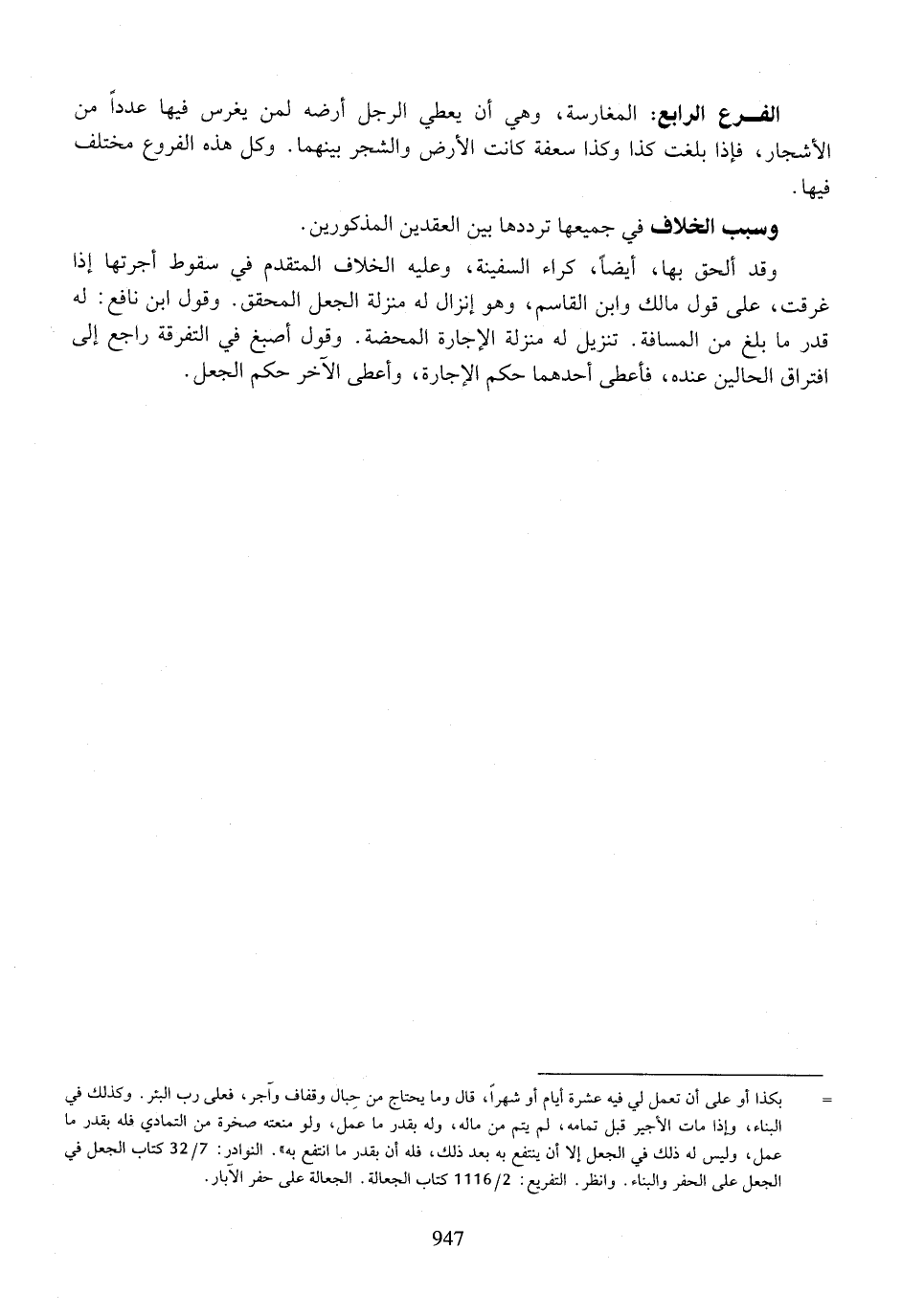 الفرع الرابع: المغارسة، وهي أن يعطي الرجل أرضه لمن يغرس فيها عددًا من الأشجار، فإذا بلغت كذا وكذا سعفة كانت الأرض والشجر بينهما. وكل هذه الفروع مختلف فيها.