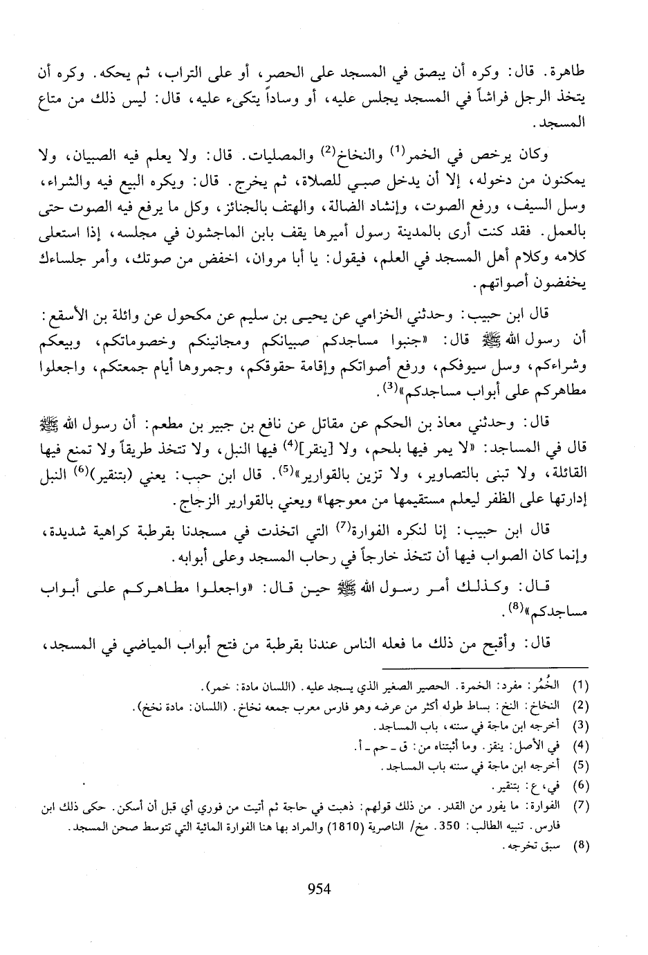 قال ابن حبيب: وحدثني الخزامي عن يحي بن سليم عن مكحول عن وائلة بن الأسقع: أن رسول الله صلى الله عليه وسلم قال: "جنبوا مساجدكم صبيانكم ومجانينكم وخصوماتكم، وبيعكم وشراءكم، وسل سيوفكم، ورفع أصواتكم وإقامة حقوقكم، وجمروها أيام جمعتكم، واجعلوا مطاهركم على أبوا مساجدكم".