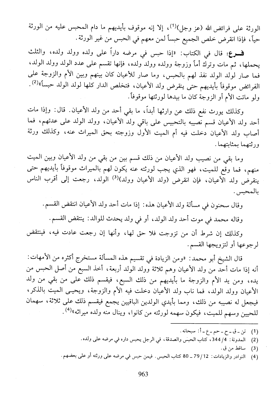 وكذلك يورث نفع ذلك عن وارثها أبداً، ما بقى أحد من ولد الأعيان. قال: وإذا مات أحد ولد الأعيان قسم نصيبه بالتحبيس على باقي ولد الأعيان، وولد الولد على عدتهم، فما أصاب ولد الأعيان دخلت فيه أم الميت الأول وزوجته بحق الميراث عنه، وكذلك ورثة ورثتهما بمثابتهما.