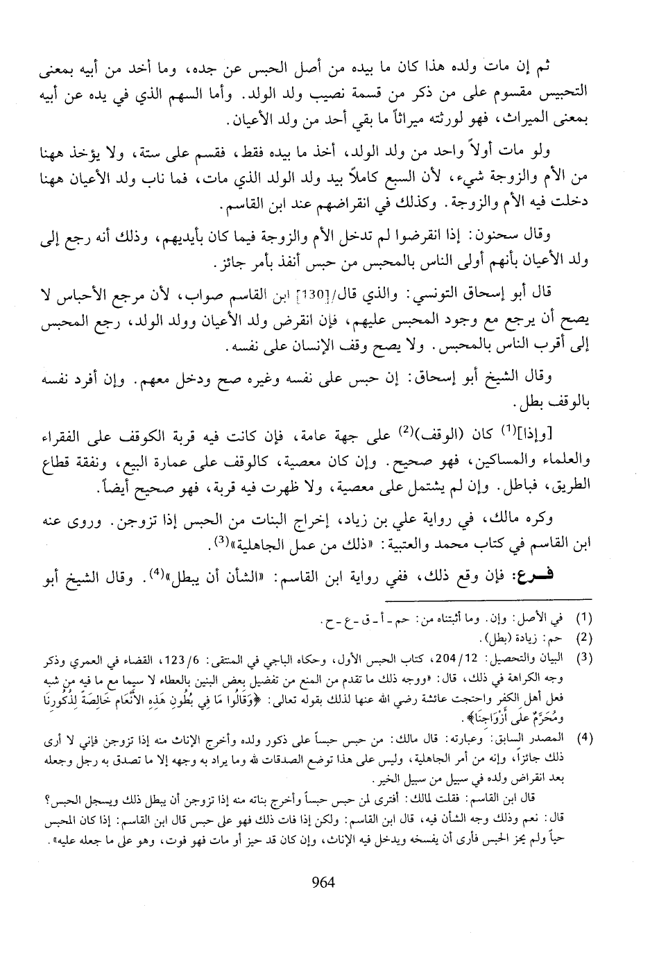 ثم إن مات ولده هذا كان ما بيده من أصل الحبس عن جده، وما أخذ من أبيه بمعنى التحبيس مقسوم على من ذكر من قسمة نصيب ولد الولد. وأما السهم الذي في يده عن أبيه بمعنى الميراث، فهو لورثته ميراثًا ما بقي أحد من ولد الأعيان.