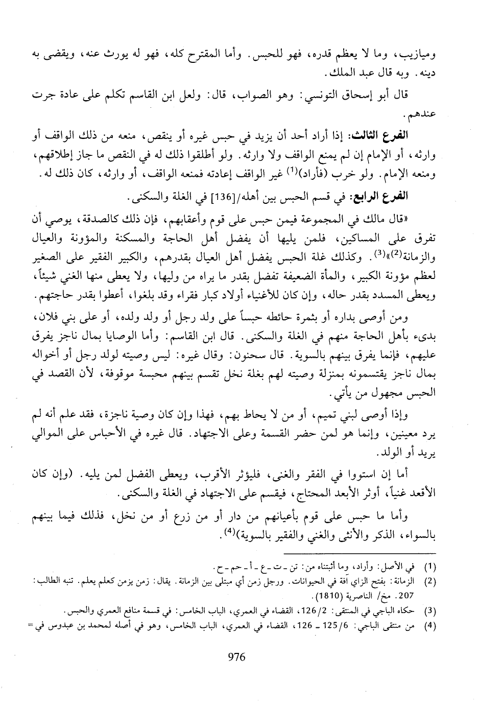 "قال مالك في المجموعة فيمن حبس على قوم وأعقابهم، فإن ذلك كالصدقة، يوصي أن تفرق على المساكين، فلمن يليها أن يفضل أهل الحاجة والمسكنة والمؤونة والعيال والزمانة. وكذلك غلة الحبس يفضل أهل العيال بقدرهم، والكبير الفقير على الصغير لعظم مؤونة الكبيرة، والمأة الضعيفة تفضل بقدر ما يراه من وليها، ولا يعطي منها الغني شيء ا، ويعطي المسدد بقدر حاله، وإن كان للأغنياء أولاد كبار فقراء وقد بلغوا، أعطوا بقدر حاجتهم.