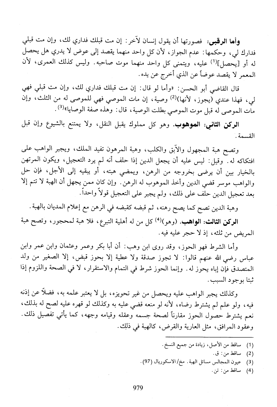 وأما الرقبى: فصورتها أن يقول إنسان لآخر: إن مت قبلك فداري لك، وإن مت قبلي فدارك لي، وحكمها عدم الجواز، لان كل واحد منهما يقصد إلى عوض لا يدري هل يحصل له أو [يحصل] عليه، ويتمنى كل واحد منهما موت صاحبه. وليس كذلك العمرى، لأن المعمر لا يقصد عوضًا عن الذي أخرج عن يده.