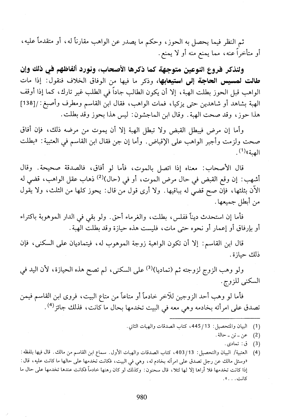 ولنذكر فروع النوعين متوجهة كما ذكرها الأصحاب، ونورد ألفاظهم في ذلك طالت لمسيس الحاجة إلى استيعابها، وذكر ما فيها من الوفاق الخلاف فنقول: إذا مات الواهب قبل الحوز بطلت الهبة بشاهد أو شاهدين حتى يزكيا، فمات الواهب، فقال ابن لقاسم ومطرف وأصبغ: هذا حوز، وقد صحت الهبة. وقال ابن الماجشون: ليس هذا بحوز وقد بطلت.