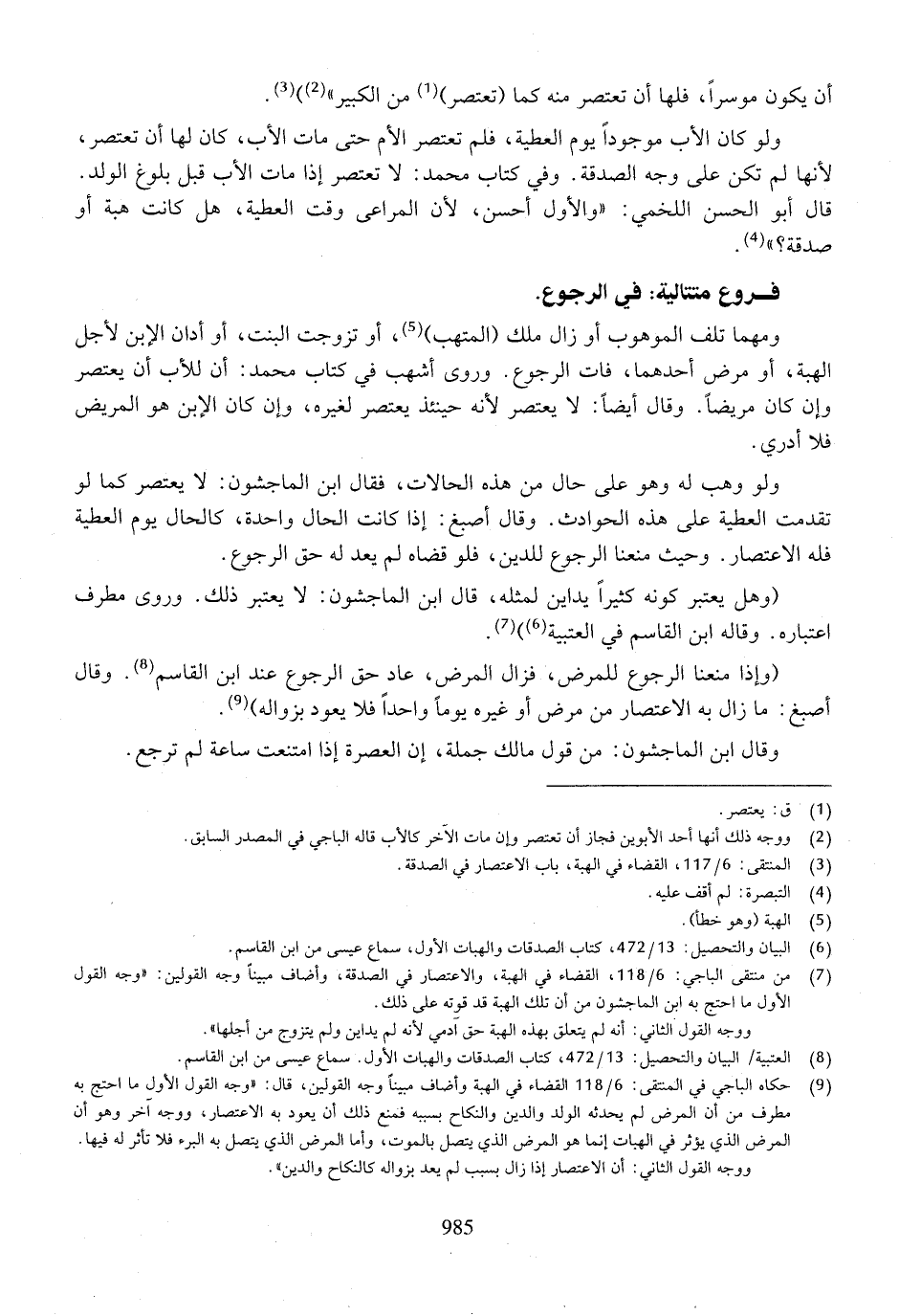 ولو وهب له وهو على حال من هذه الحالات، فقال ابن الماجشون: لا يعتصر كما لو تقدمت العطية على هذه الحوادث. وقال أصبغ: إذا كانت الحال واحدة، كالحال يوم العطية فله الاعتصار. وحيث منعنا الرجوع للدين، فلو قضاه لم يعد له حق الرجوع. (وهل يعتبر كونه كثيرًا يداين لمثله، قال ابن الماجشون: لا يعتبر ذلك. وروى مطرف اعتباره. وقاله ابن القاسم في العتبية.