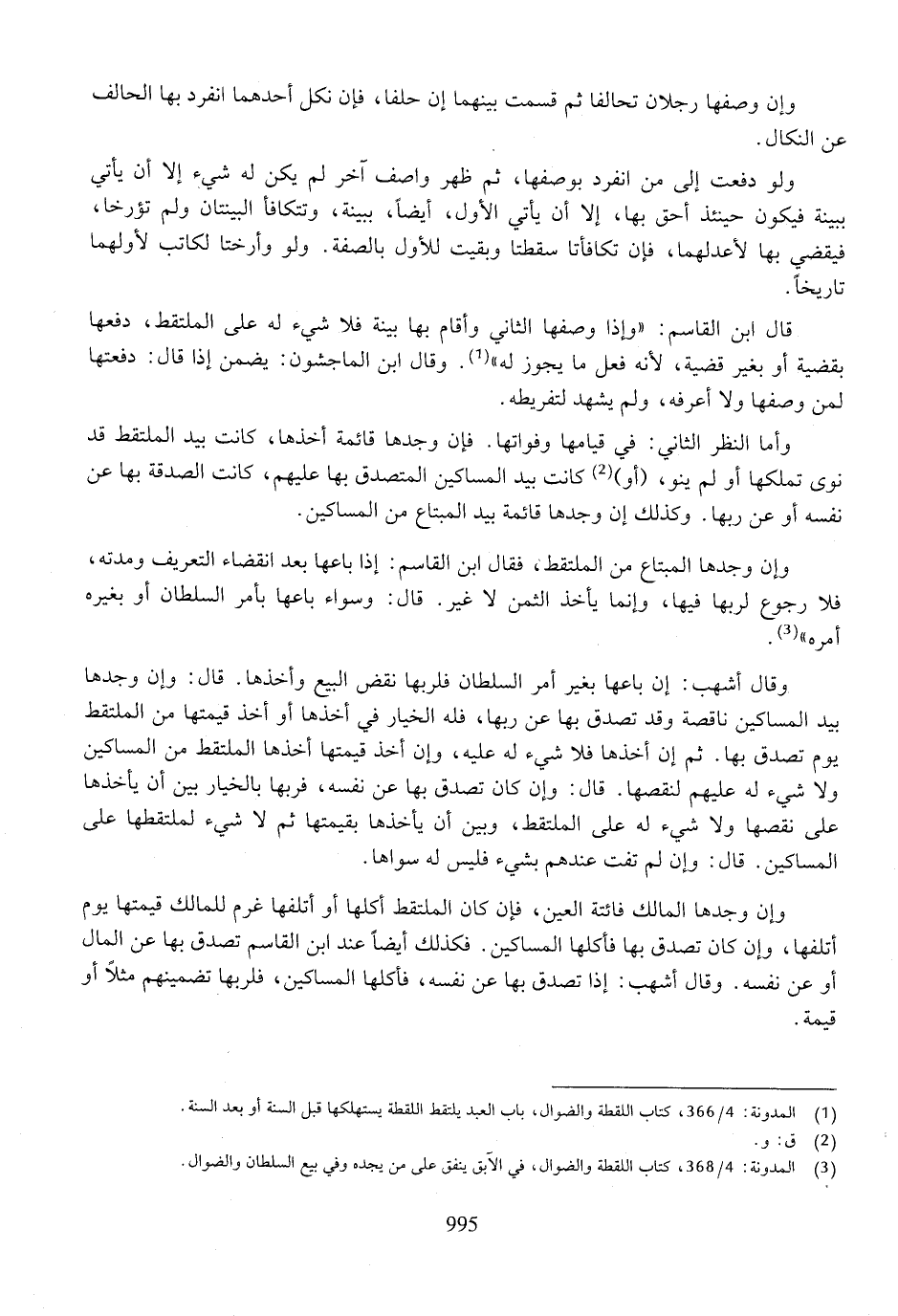 وأما النظر الثاني: في قيامها وفواتها. فإن وجدها قائمة أخذها، كانت بيد الملتقط في نوى تملكها أو ينو، [أو) كانت بيد المساكين المتصدق بها عليهم، كانت الصدقة بها عن نفسه أو عن ربها. وكذلك إن وجدها قائمة بيد المبتاع من المساكين.