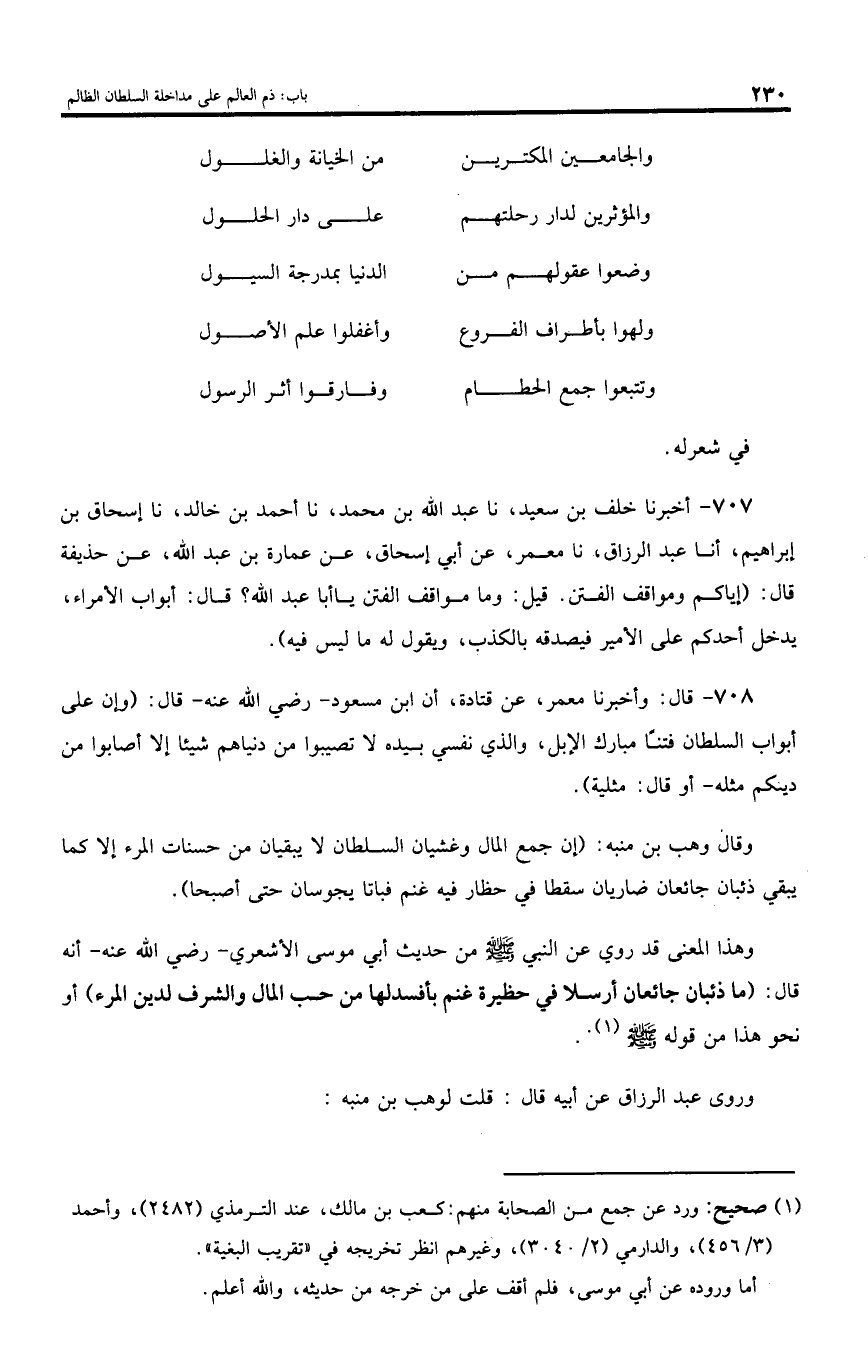 708 - قال: وأخبرنا معمر، عن قتادة، أن ابن مسعود - رضي اللّه عنه - قال: (و إن على أبواب السلطان فتنا مبارك الإبل، والذي نفسي بيده لا تصيبوا من دنياهم شيئا إلا أصابوا من دينكم مثله - أو قال: مثلية).