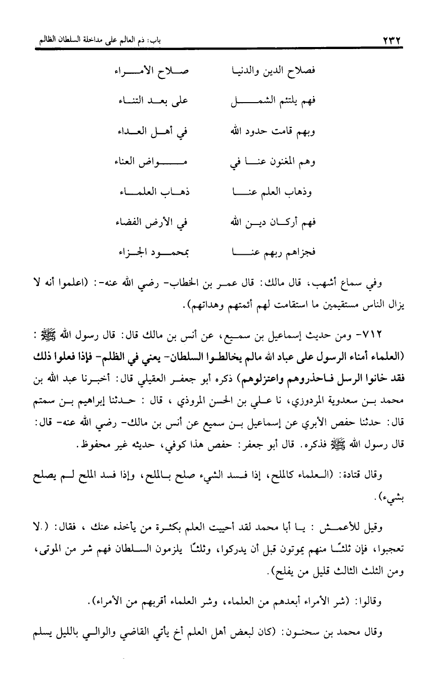 (العماء أمناء الرسول على عباد اللّه ما لم يخالطوا السلطان - يعني في الظلم - فإذا فعلوا ذلك فقد خانوا الرسل فاحذروهم واعتزلوهم) ذكره أبو جعفر العقيلي قال: أخبرنا عبد اللّه بن محمد بن سعدوية المردوزي، نا علي بن الحسن المروذي، قال: حدثنا إبراهيم بن سمتم قال: حدثنا حفص الأبري عن إسماعيل بن سميع عن أنس بن مالك - رضي اللّه عنه - قال: قال رسول اللّه صلى اللّه عليه وسلم فذكره. قال أبو جعفر: حفص هذا كوفي، حديثه غير محفوظ.