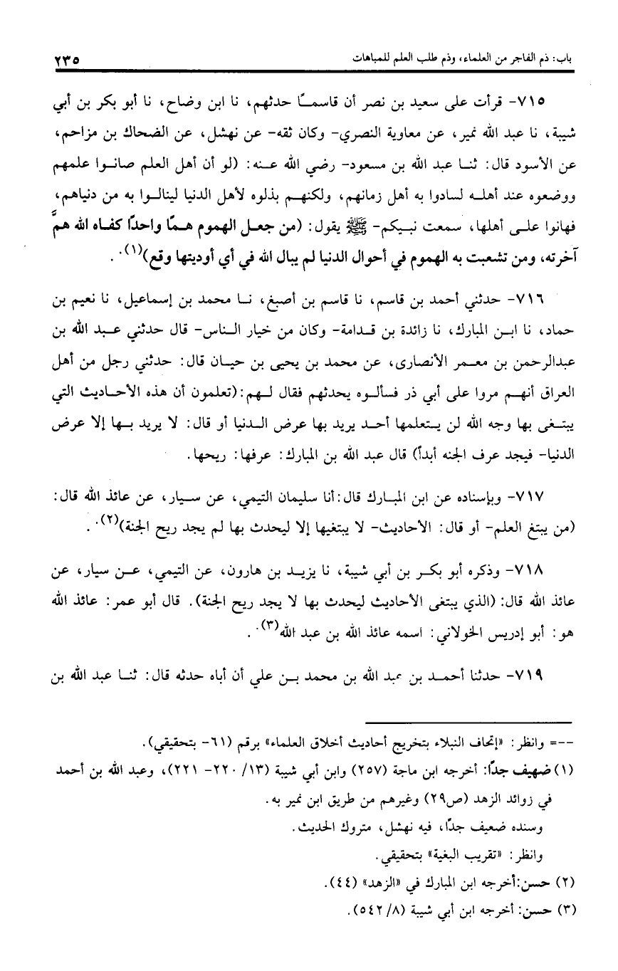 715 - قرأت على سعيد بن نصر أن قاسما حدثهم، نا ابن وضاح، نا أبو بكر بن أبي شيبة، نا عبد اللّه نمير، عن معاوية النصري - وكان ثقه - عن نهشل، عن الضحاك بن مزاحم، عن الأسود قال: ثنا عبد اللّه بن مسعود - رضي اللّه عنه: (لو أن أهل العلم صانوا علمهم ووضعوه عند أهله لسادوا به أهل زمانهم، ولكنهم بذلوه لأهل الدنيا لينالوا به من دنياهم، فهانوا على أهلها، سمعت نبيكم - صلى اللّه عليه وسلم يقول: (من جعل الهموم هما واحدا كفاه اللّه همّ آخرته، ومن تشعبت به الهموم في أحوال الدنيا لم يبال اللّه في أي أوديتها وقع).