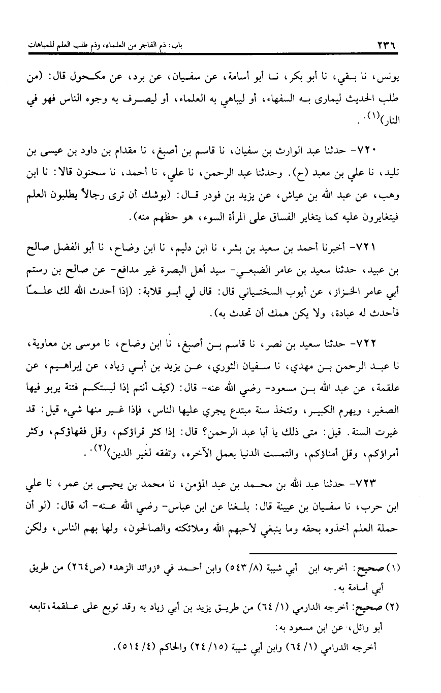 720 - حدثنا عبد الوارث بن سفيان، نا قاسم بن أصبغ، نا مقدام بن داود بن عيسى بن تليد، نا علي بن معبد (ح). وحدثنا عبد الرحمن، نا علي، نا أحمد، نا سحنون قالا: نا ابن وهب، عن عبد اللّه بن عياش، عن يزيد بن فودر قال: (يوشك أن ترى رجالا يطلبون العلم فيتغايرون عليه كما يتغاير الفساق على المرأة السوء، هو حظهم منه).