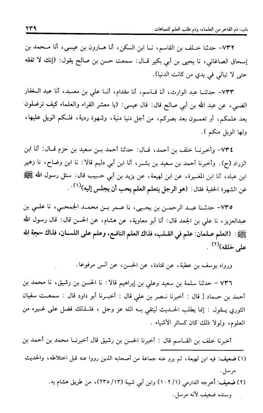 735 - حدثنا عبد الرحمن بن يحيى، نا عمر بن محمد الجمحي، نا علي بن عبد العزيز، نا علي بن الجعد قال: أنا أبو معاوية، عن هشام، عن الحسن قال: قال رسول اللّه صلى اللّه عليه وسلم: (العلم علمان: علم في القلب، فذاك العلم النافع، وعلم على اللسان، فذاك حجة اللّه على خلقه)»
