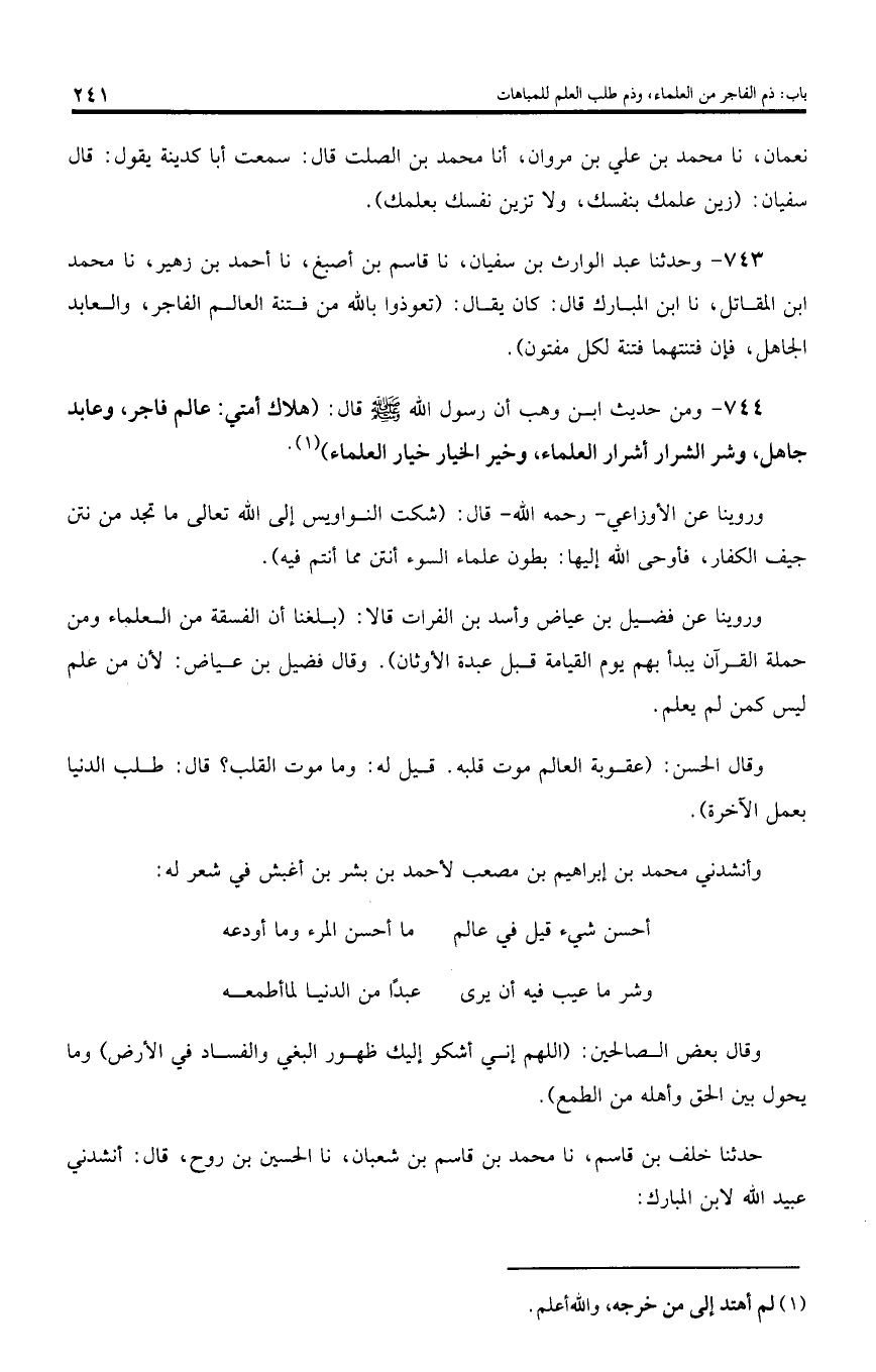 743 - وحدثنا عبد الوارث بن سفيان، نا قاسم بن أصبغ، نا أحمد بن زهير، نا محمد ابن المقاتل، نا ابن المبارك قال: كان يقال: (تعوذوا باللّه من فتنة العالم الفاجر، والعابد الجاهل، فإن فتنتهما فتنة لكل مفتون).