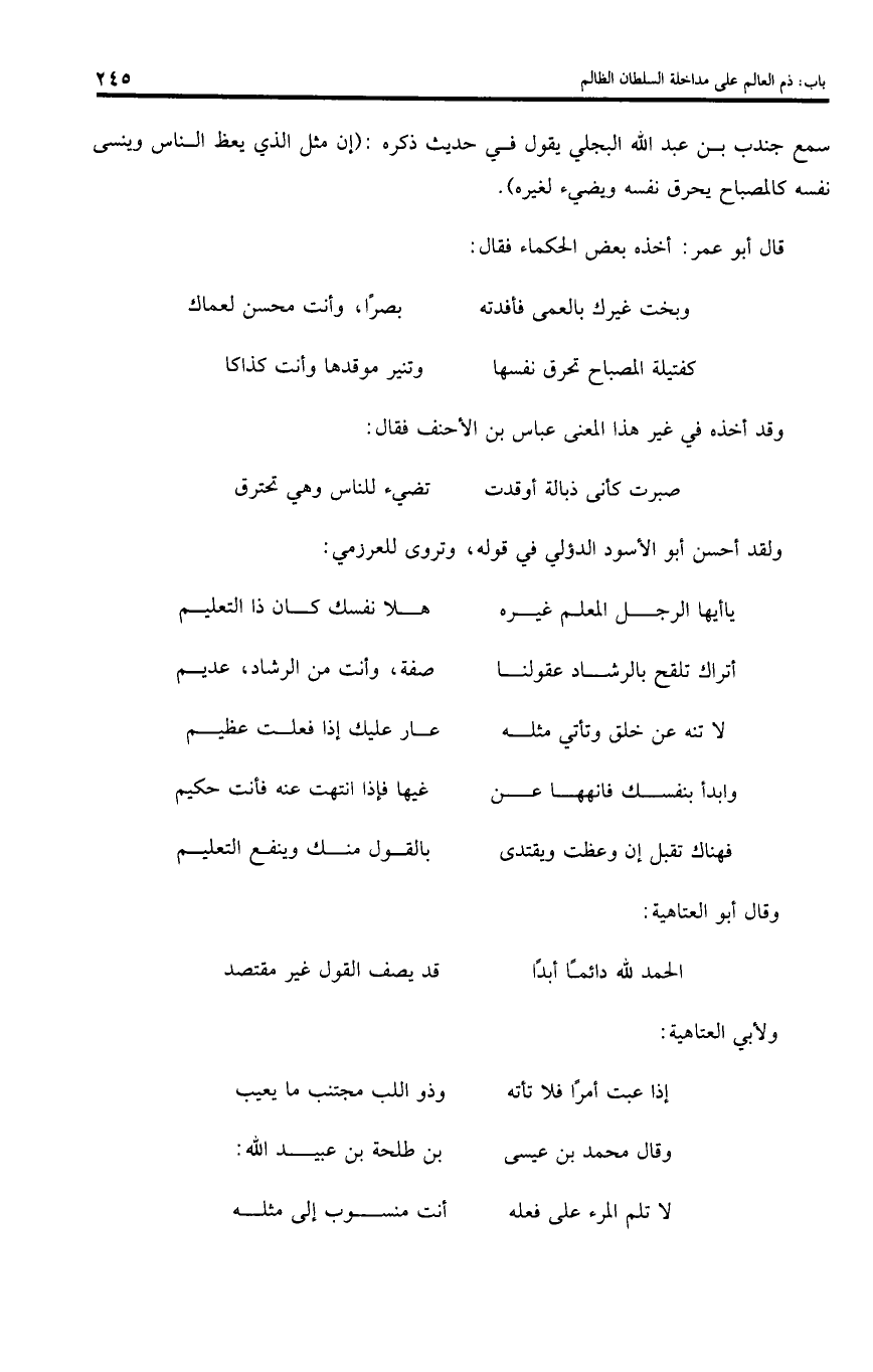 سمع جندب بن عبد اللّه البجلي يقول في حديث ذكره: (إن مثل الذي يعظ الناس وينسى نفسه كالمصباح يحرق نفسه ويضيء لغيره).