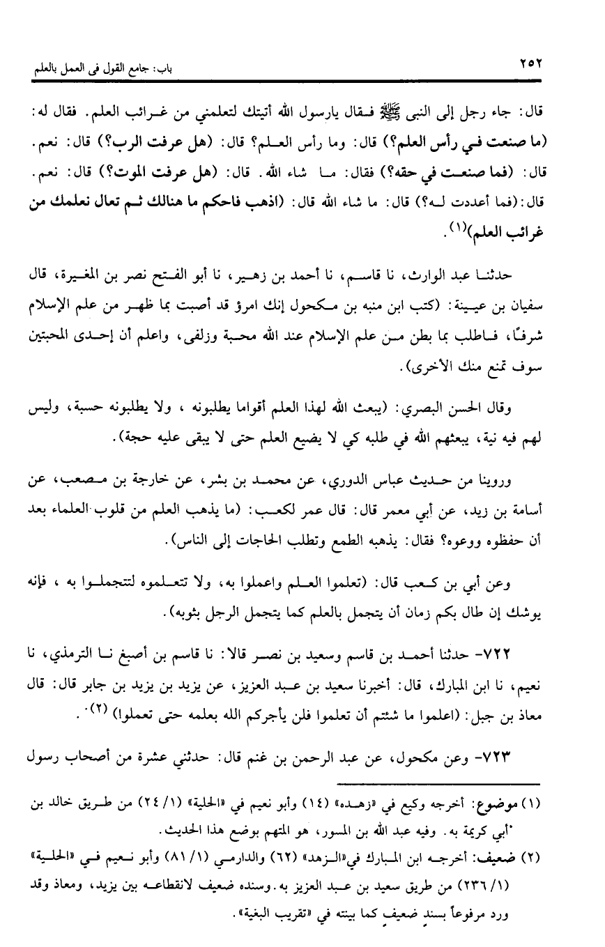 722 - حدثنا أحمد بن قاسم وسعيد بن نصر قالا: نا قاسم بن أصبغ نا الترمذي، نا نعيم، نا ابن المبارك، قال: أخبرنا سعيد بن عبد العزيز، عن يزيد بن يزيد بن جابر قال: قال معاذ بن جبل: (اعلموا ما شئتم أن تعلموا فلن يأجركم اللّه بعلمه حتى تعملوا).