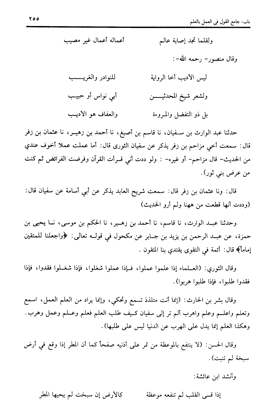 حدثنا عبد الوارث بن سفيان، نا قاسم بن أصبغ، نا أحمد بن زهير، نا عثمان بن زفر قال: سمعت أخي مزاحم بن زفر يذكر عن سفيان الثورى قال: أما عملت عملا أخوف عندي من الحديث - قال مزاحم - أو غيره -: ولو ددت أني قرأت القرآن وفرضت الفرائض ثم كنت من عرض بني ثور).