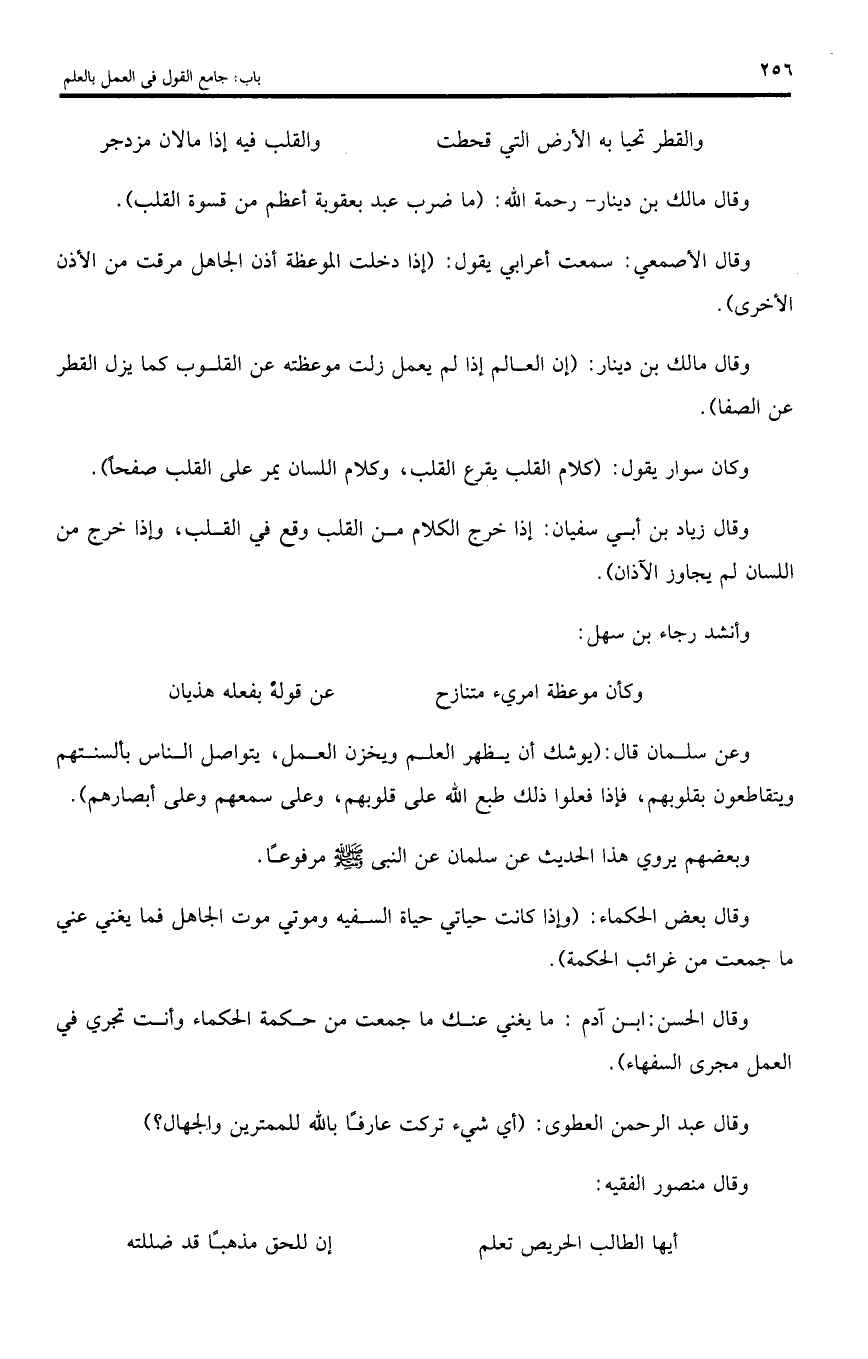 وقال مالك بن دينار: (إن العالم إذا لم يعمل زلت موعظته عن القلوب كما يزل القطر عن الصفا).