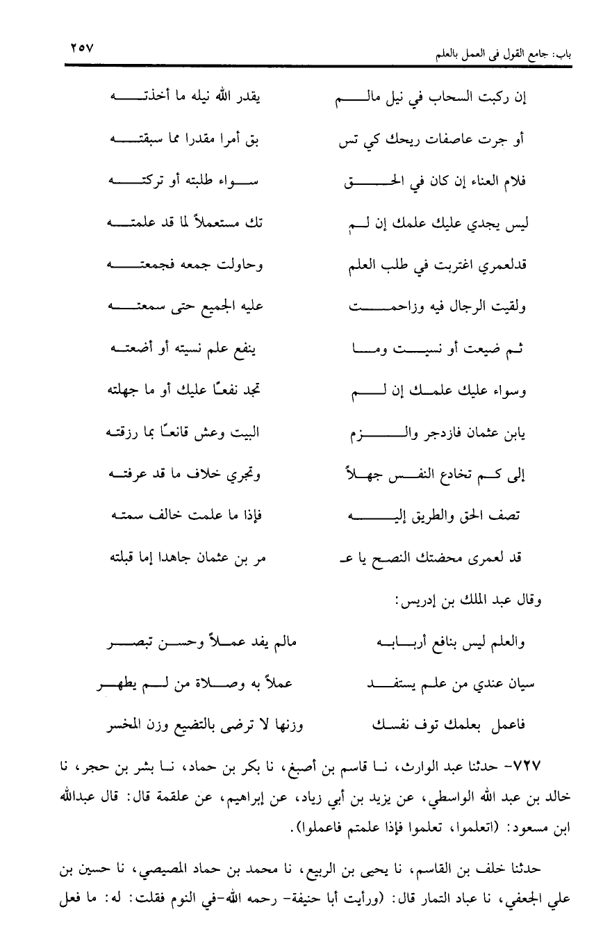 727 - حدثنا عبد الوارث، نا قاسم بن أصبغ، نا بكر بن حماد، نا بشر بن حجر، نا خالد بن عبد اللّه الواسطي، عن يزيد بن أبي زياد، عن إبراهيم، عن علقمة قال: قال عبد اللّه ابن مسعود: (اتعلموا، تعلموا فإذا علمتم فاعملوا).