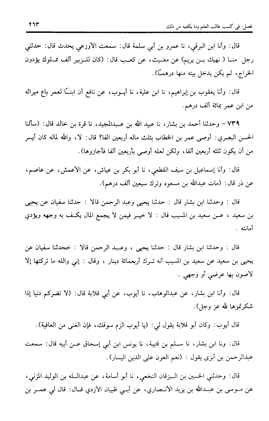 قال: وحدثنا ابن بشار قال: حدثنا يحيى وعبد الرحمن قالا: حدثنا سفيان عن يحيى بن سعيد، عن سعيد بن المسيب قال: لا خير فيمن لا يجمع المال يكف به وجهه ويؤدي أمانته.