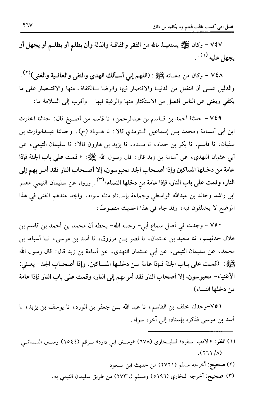 750 - وجدت في أصل سماع أبي - رحمه اللّه - بخطه أن محمد بن أحمد بن قاسم بن هلال حدثهم، ثنا سعيد بن عثمان، نا نصر بن مرزوق، نا أسد بن موسى، نا أسباط بن محمد، عن سليمان التيمي، عن أبي عثمان النهدى، عن أسامة بن زيد قال: قال رسول اللّه صلى اللّه عليه وسلم: (قمت على باب الجنة فإذا عامة من دخلها المساكين، وإذا أصحاب الجد - يعني: