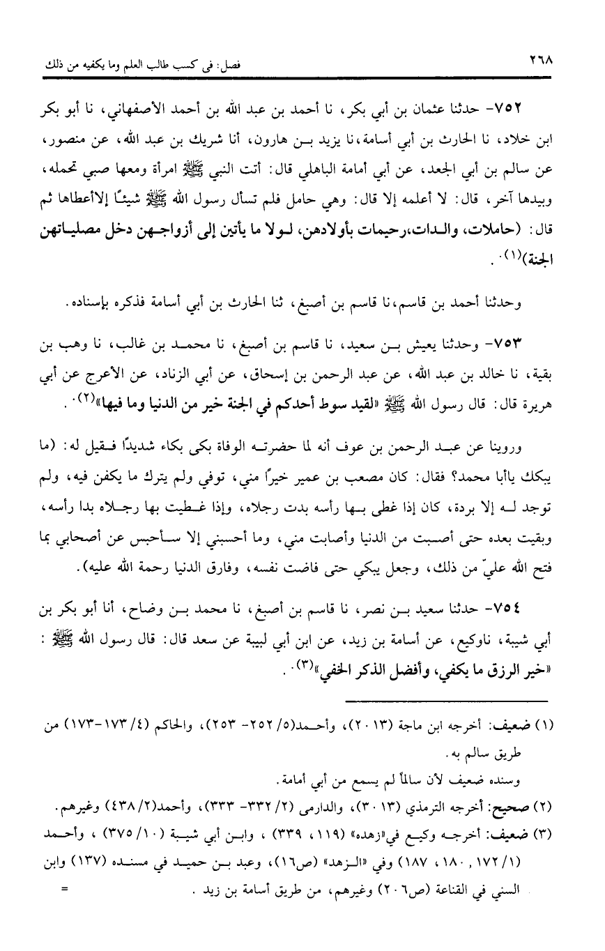 752 - حدثنا عثمان بن أبي بكر، نا أحمد بن عبد اللّه بن أحمد الأصفهاني، نا أبو بكر ابن خلاد، نا الحارث بن أبي أسامة، نا يزيد بن هارون، أنا شريك بن عبد اللّه، عن منصور، عن سالم بن أبي الجعد، عن أبي أمامة الباهلي قال: أتت النبي صلى اللّه عليه وسلم امرأة ومعها صبي تحمله، وبيدها آخر، قال: لا أعلمه إلا قال: وهي حامل فلم تسأل رسول اللّه صلى اللّه عليه وسلم شيئا إلا أعطاها ثم قال: (حاملات، والدات، رحيمات بأولادهن، لولا ما يأتين إلى أزواجهن دخل مصلياتهن الجنة).